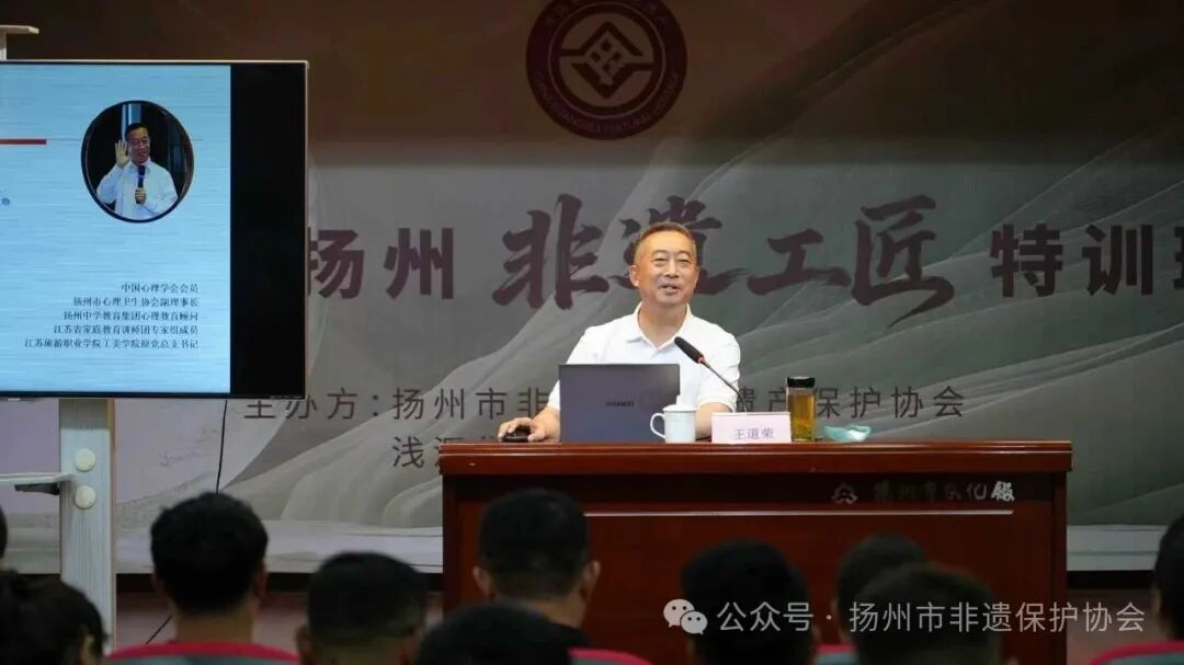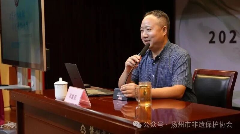 扬州文化馆副馆长、协会副秘书长孙富泉、副研究馆员和大家分享了《涵养文化根脉 坚定文化自信》,讲述了扬州非遗的博大精深,阐释了非遗传承的价值,明确了当代非遗传人和非遗工作者的责任和担当;
